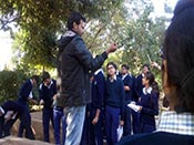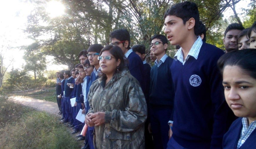 The art of making statue of equal size and the usage of Geometry and Symmetry were clearly visible on the remains present. After two hours of sightseeing, students proceeded to Sundarvan Camp Sight. The fresh fields of mustard with yellow flowers welcomed the students. Birds like Turkey and Goose were also seen. At 3:30 p.m. the Trekking to Bakor forest started. It was a deep narrow stretch of nearly two and a half km. which had many trees with flowers and distinctive leaves. The tree named ‘Tendu’ ( Asian ebony tree) whose leaves are used for making Beedis was also spotted. The other trees like Mahua ( butter tree), custard apple various berries were also seen. The jungle was full of Teak trees. The guide to the forest told that the Trekking path became a river in rainy season as the lake water coming from Aravallis flows down during the period. The lake had beautiful water falls with crystal clear water and Aravalli mountain standing as a guard. The boulders big and small were all clear and the place was full of birds and wild life like Hyena, Neel Gay etc. It was told that Leopard visited the lake to drink water.