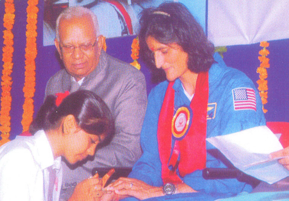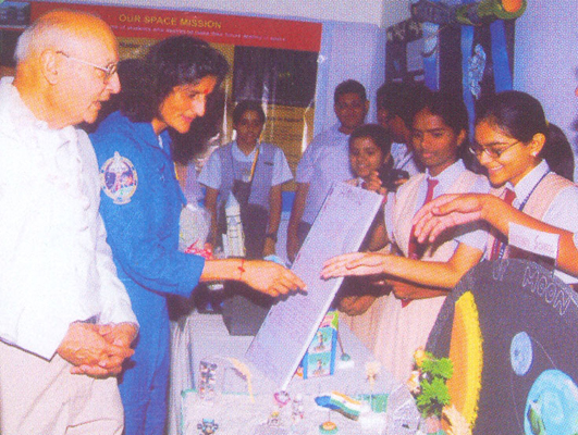Sunita Williams observing the projects prepared by the students of R.E.H.S.S. accompanied by the Convenoir Shri Bherulal G. Jain |