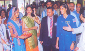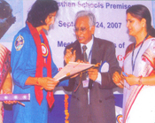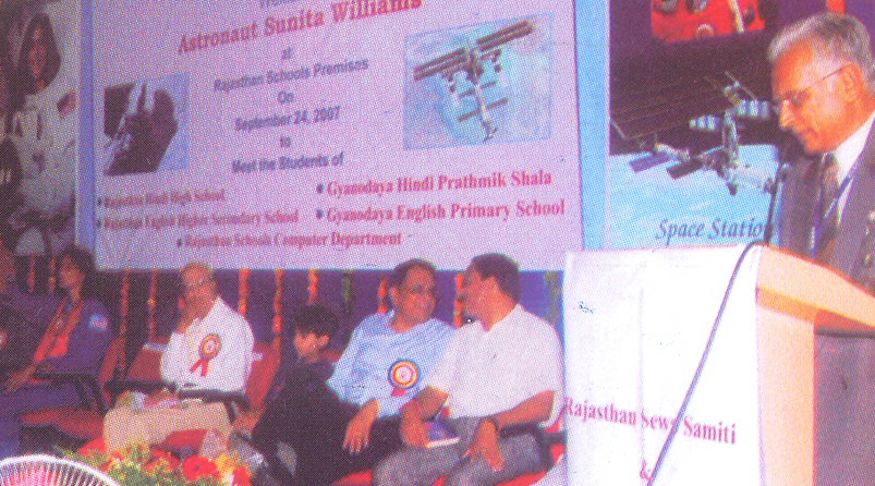 | A student of Rajasthan School putting Mehndi on the hand of the Astronaut Sunita Williams while Shri Khimraj JAin, the president of Rajasthan Seva Samiti looking on it |